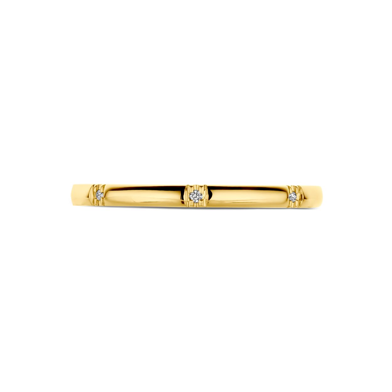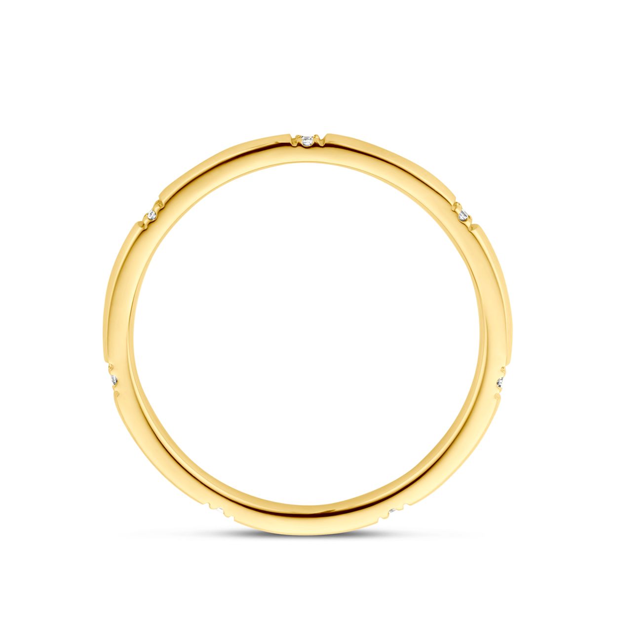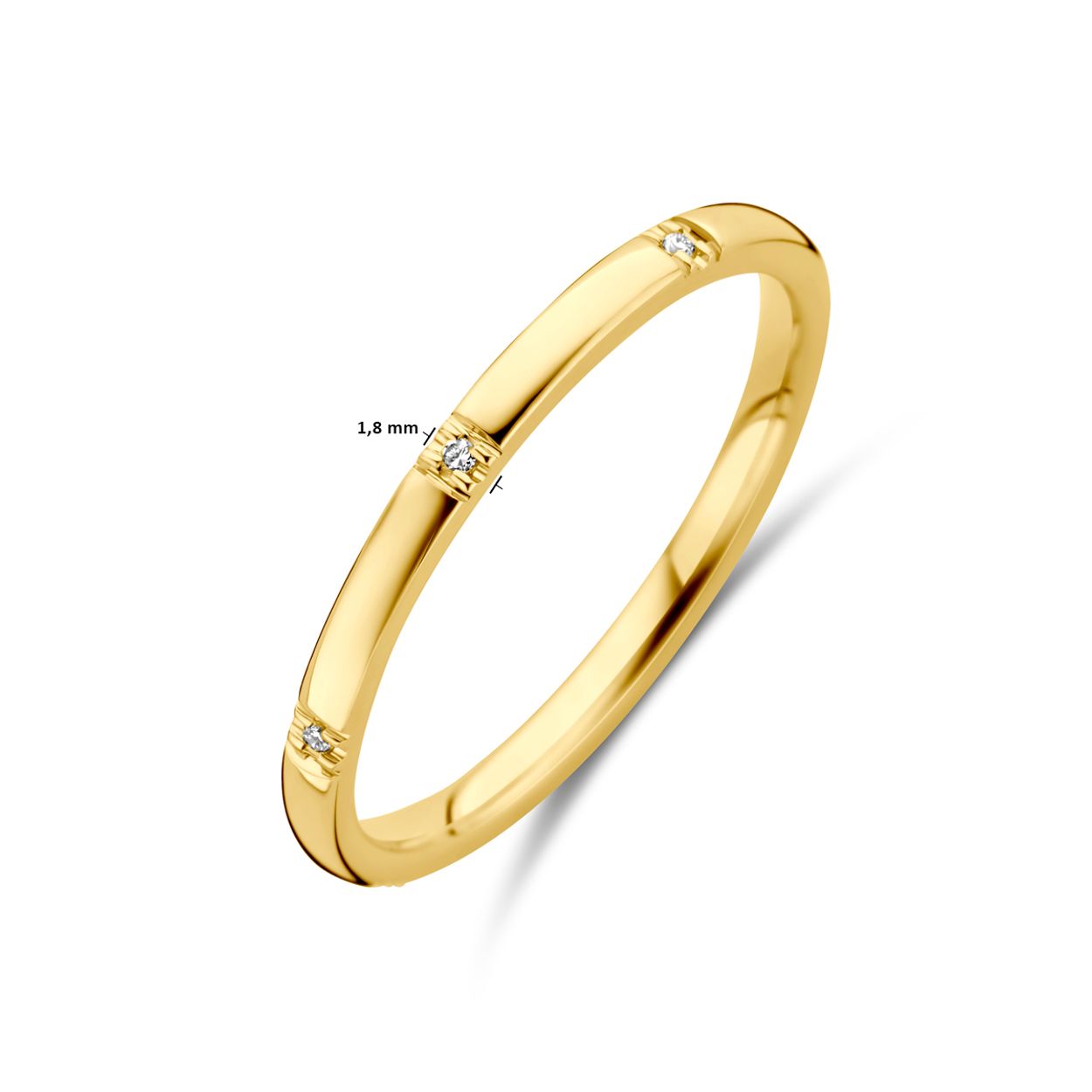 14k Geelgouden ring uitgevoerd met diamant. De ring heeft een breedte van 1.8mm. De totale diamantgewicht is 0.03ct.