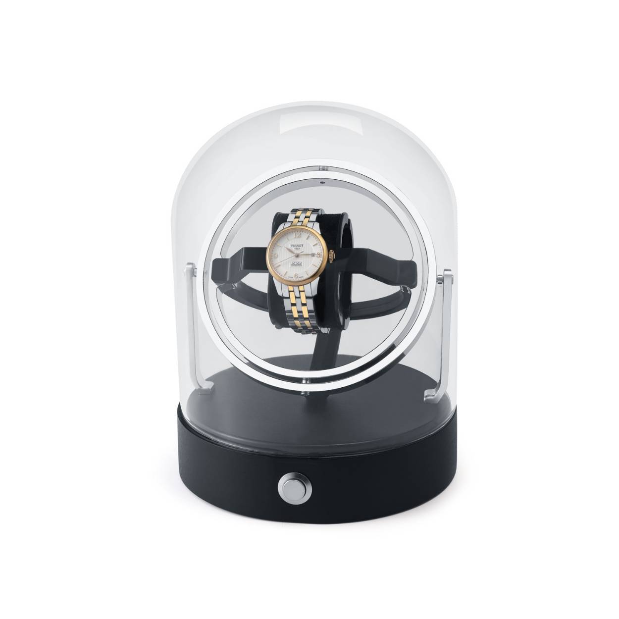 het horloge wordt in de ECHT GLAZEN stolp met een 360° ROTATIE bewogen (die de natuurlijke beweging van de hand het dichtst benadert en daarom bijzonder goed is voor uw horloge). Er kunnen drie intervalprogramma's worden ingesteld (rotatie van elk 2 minuten, daarna 4, 10 of 18 minuten pauze, herhaling).