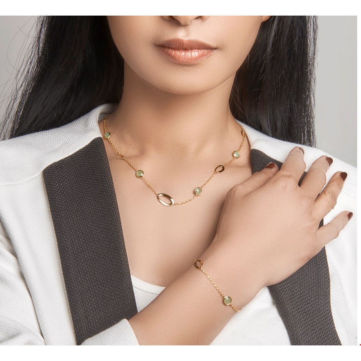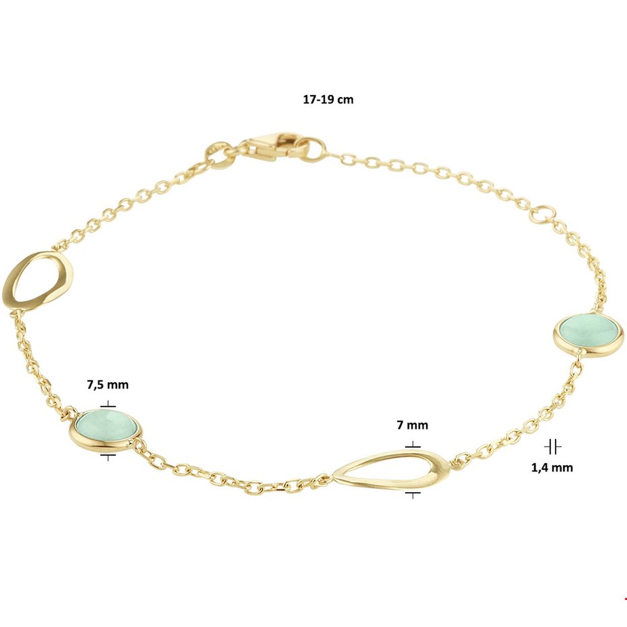 Pasteltinten zijn mooi! Tussen de 14k geelgouden ankerschakels van deze armband vind je gouden tussenstukjes en groene aventurijnstenen in een ronde zetkast. De lengte van de armband is 17cm, met een verlengstuk van 2cm. Op het breedste punt is de armband 7mm. De armband kan worden gesloten met een stevige karabijnsluiting.