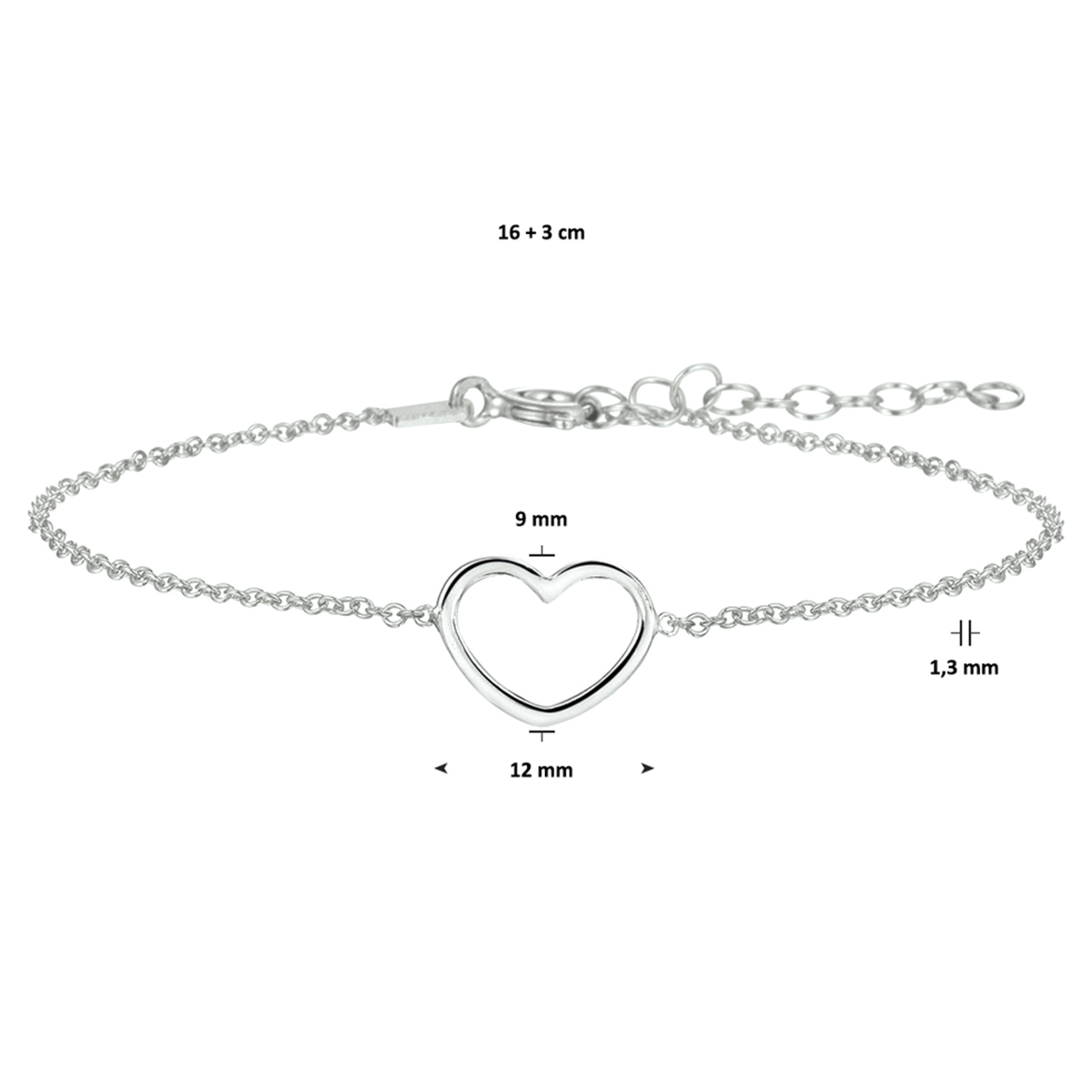 Gerhodineerd zilveren 1.3mm anker armband met een lengte van 16cm en een extensie van 3cm uitgevoerd met een hartje van 9x12mm. Tip: Leuk om kado te geven aan een dierbare of je geliefde. Gegarandeerd dat ze het hart zal waarderen!