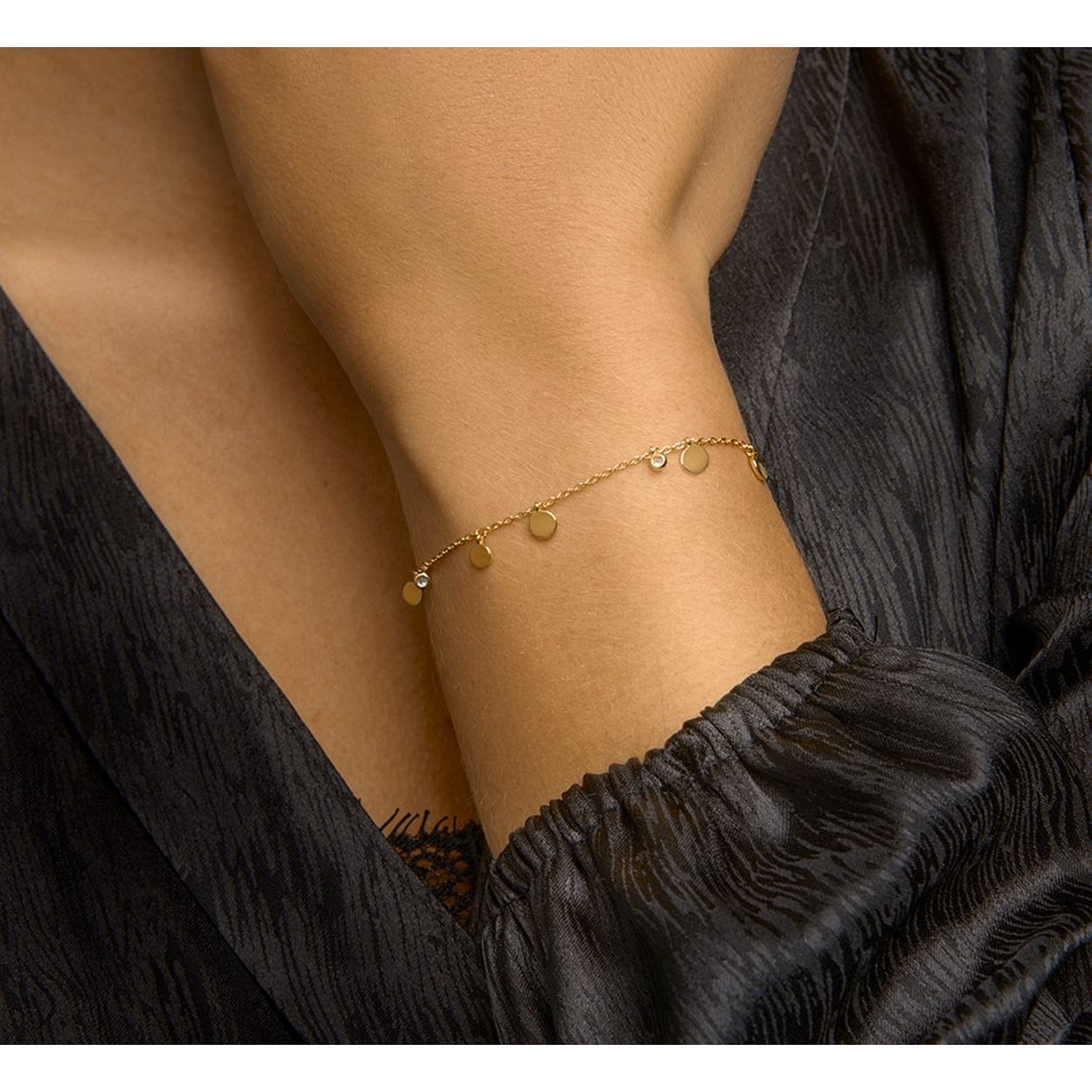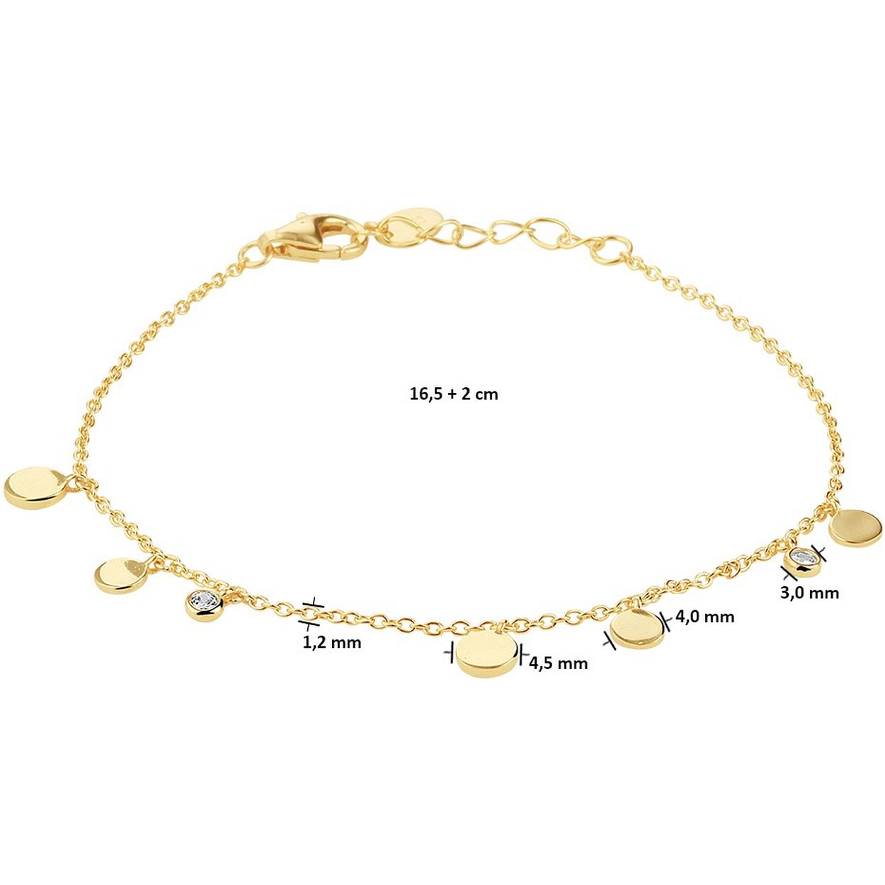 Geelgoud op 925 zilveren armband uitgevoerd met rondjes en zirkonia. De armband heeft een draaglengte van 16.5cm met een extensie van 2cm en een stevige karabijn sluiting.