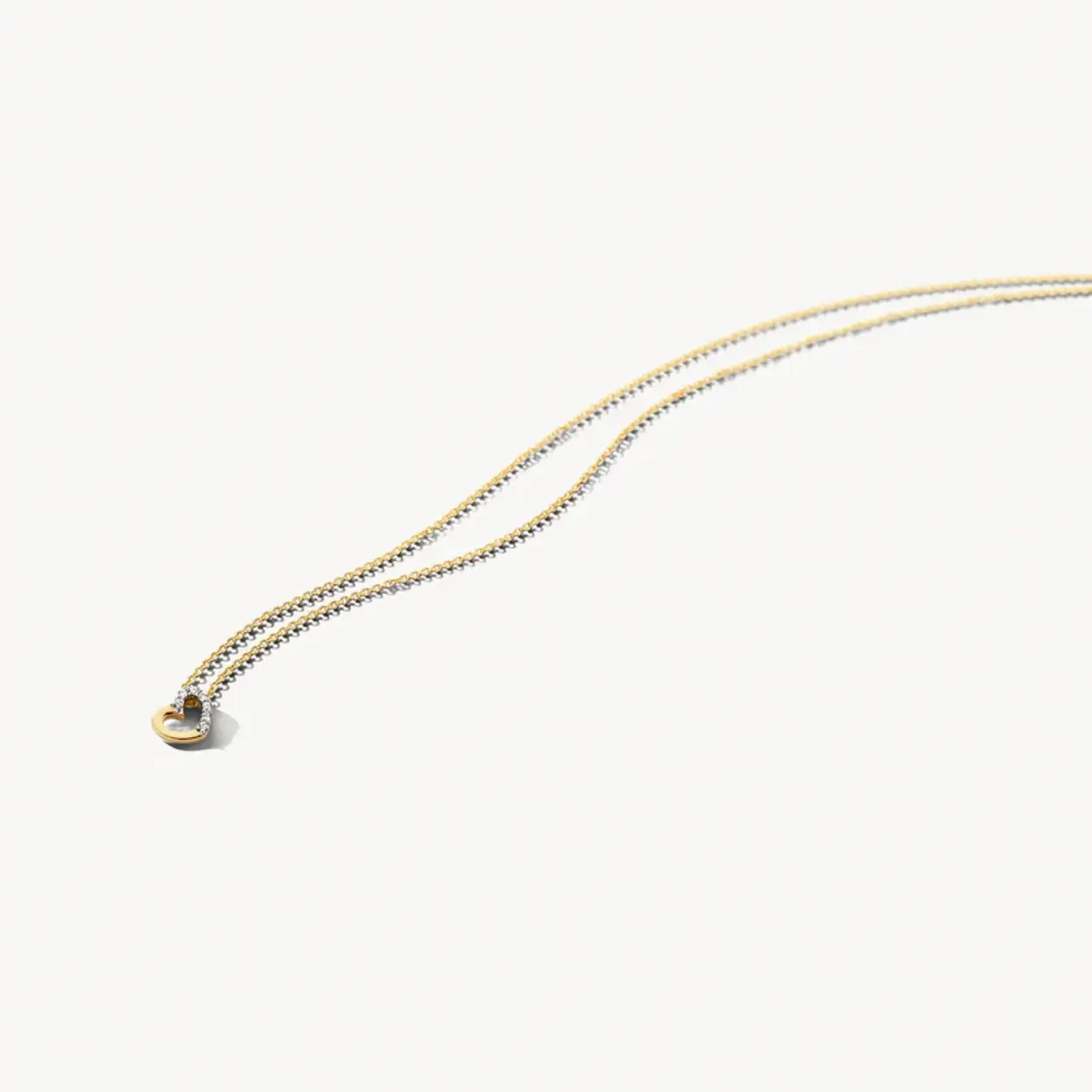 Aan dit 14k gouden collier glinstert een wit- en geelgouden hart dat voor de helft bezet is met briljant geslepen diamanten. De diamantjes hebben een totaalgewicht van 0,03 karaat en het collier is 42 cm lang.