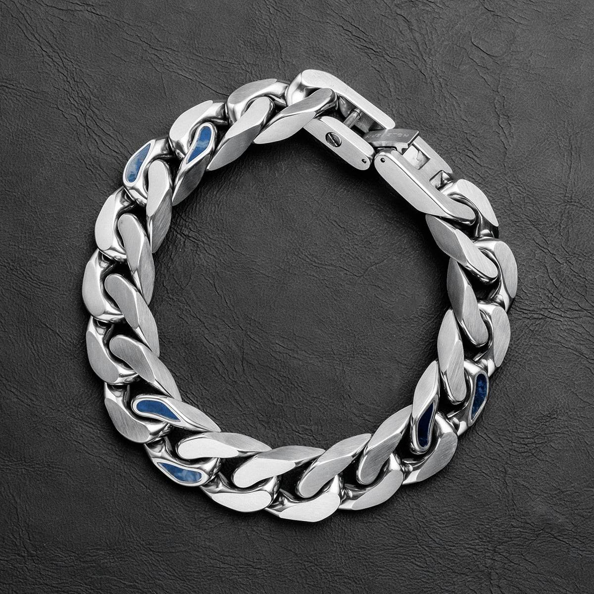 Opvallende roestvrijstalen schakels vormen de basis van deze armband en draperen een koele, glanzende afwerking rond je pols. Regelmatig voegen subtiele accenten van echt sodaliet een natuurlijke textuur, kleur en karakter toe, terwijl het geheel perfect waterbestendig is dankzij onze innovatieve Hydro-Defense coating.
