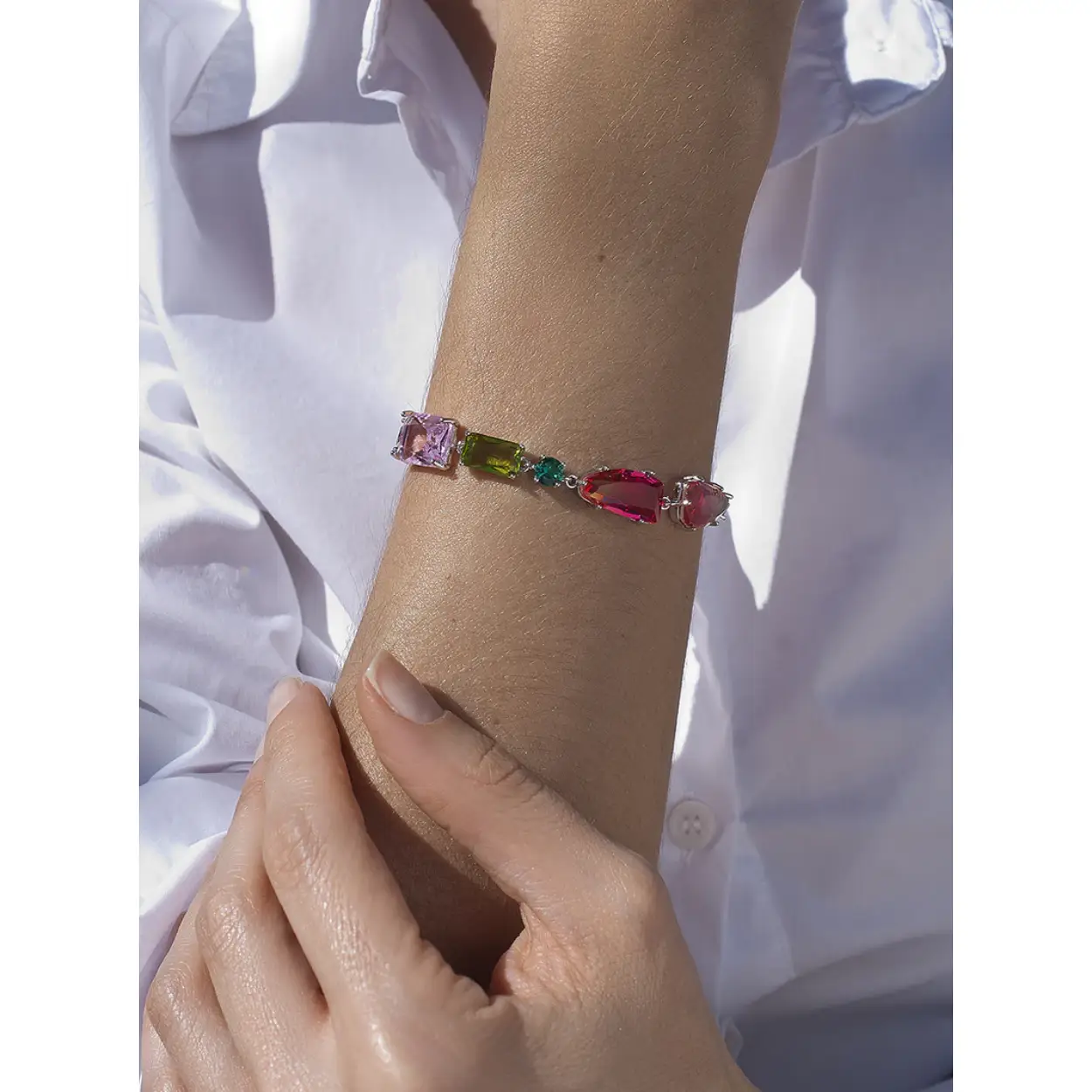 Bracelets with silver stones design in green and blue tones for women. Colors and tones that will make you shine. Bracelet with silver stones in pistachio, pink, malachite, garnet and gradient in round and princess sizes. An elegant and sophisticated piece, ideal for your big occasions.