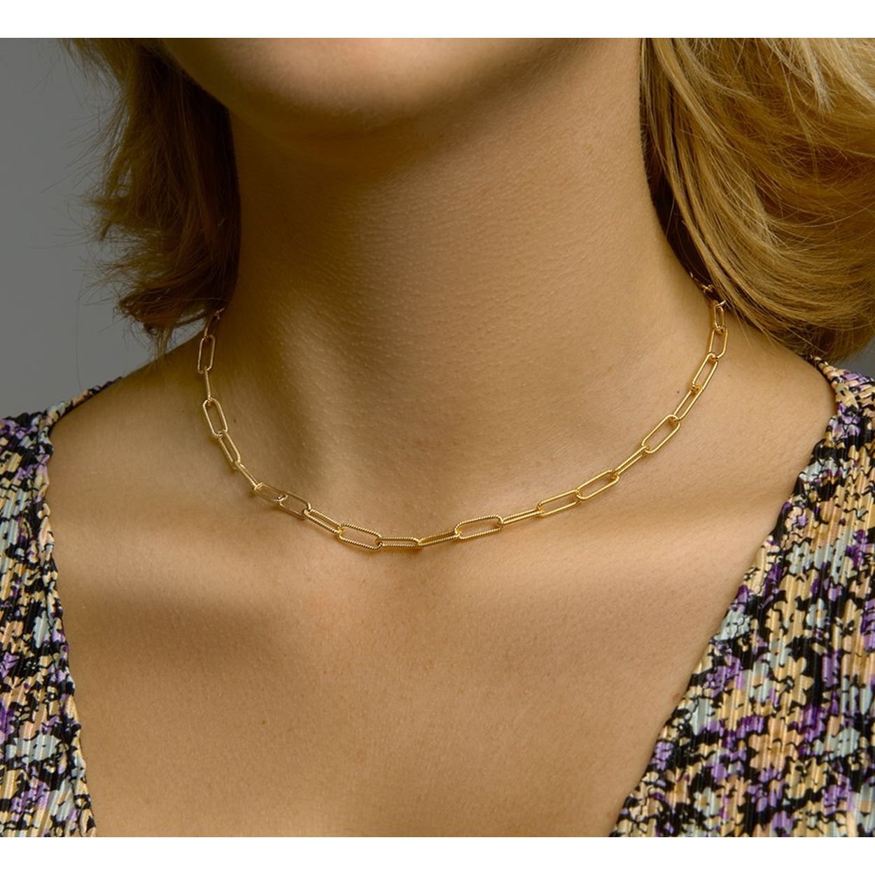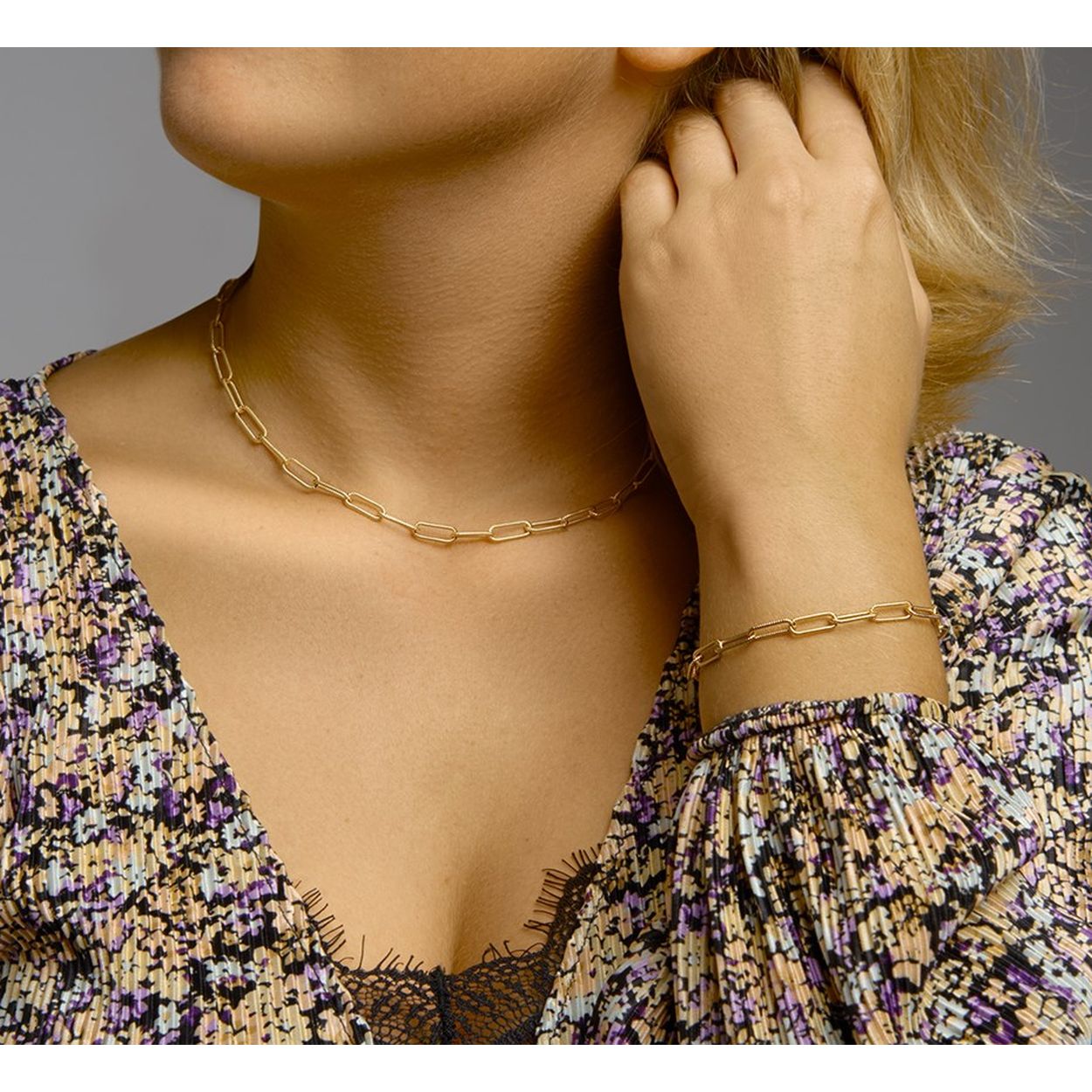 Geelgoud op 925 zilveren paperclip collier met een schakelbreedte van 5mm en een gediamanteerde afwerking. Het collier heeft een draaglengte van 40cm met een extensie van 4cm en een stevige karabijn sluiting.