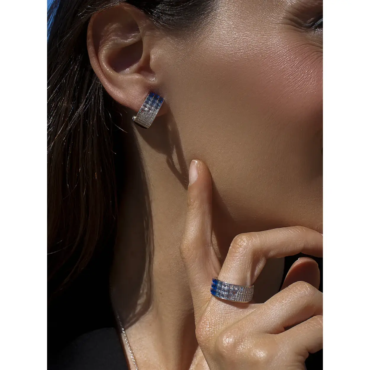 Silver omega clasp earrings triple rail with blue gemstones for women. Silver omega clasp earrings made up of three rails, half of multicolored emerald-cut zirconia, in shades of azurite, chalcedony and light blue and the other half of white zirconia. Combine them with the matching pendant and ring and get a total look, you will shine!