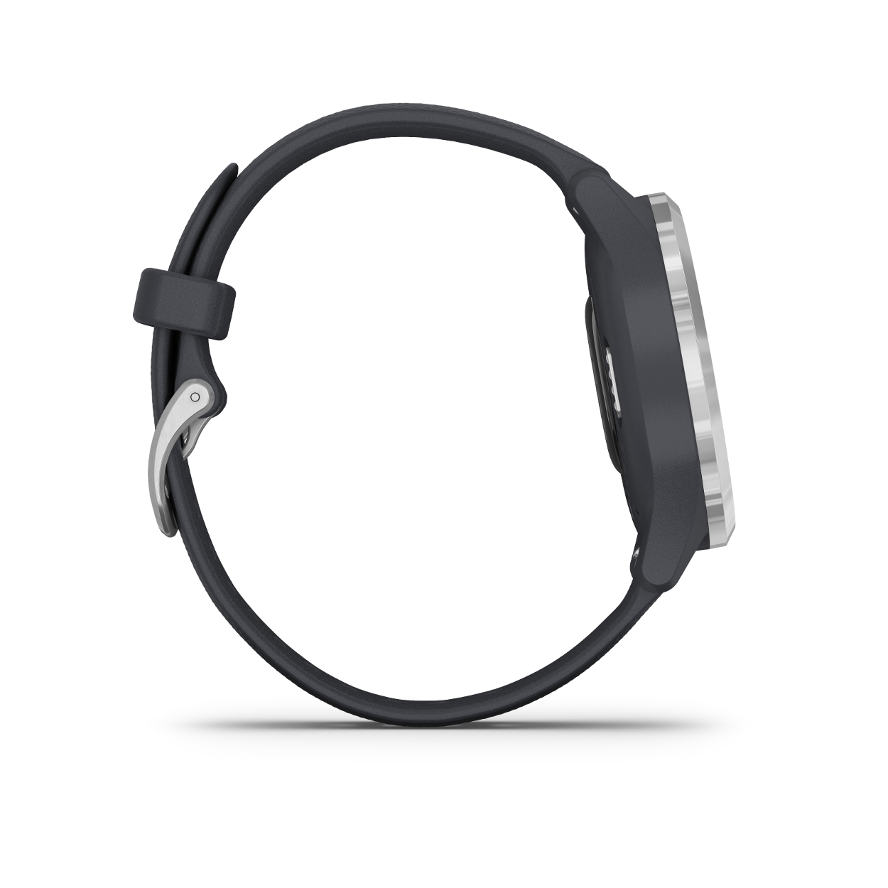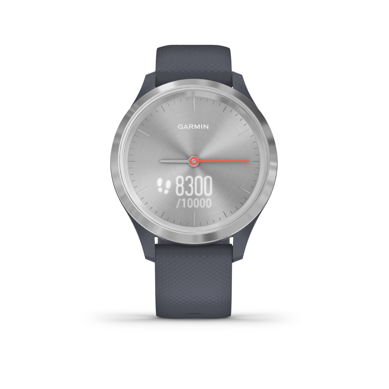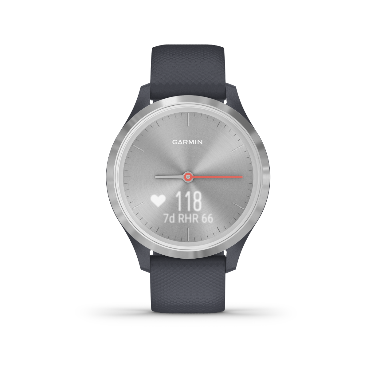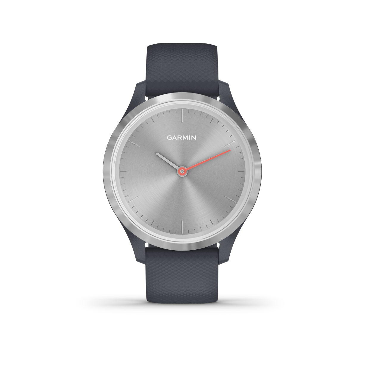 Zilverkleurige rand van roestvrij staal met granite blue behuizing en siliconen polsband