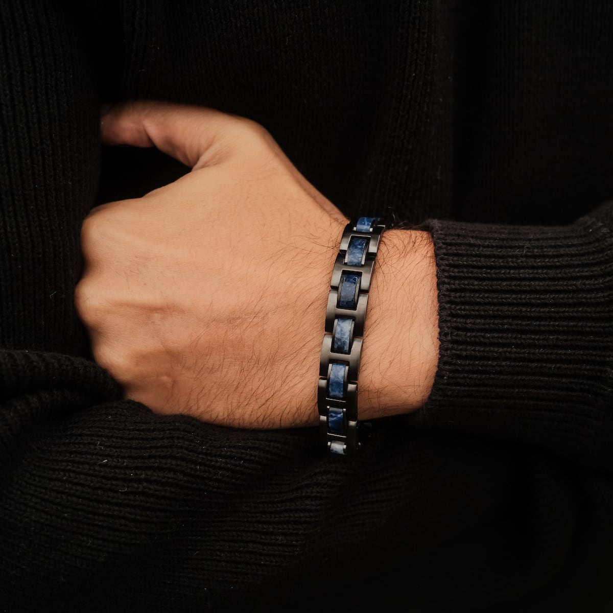 Gemaakt van bijzondere sodalietinlegsels in blauw en hoogwaardig grijs roestvrij staal - een bandje waarvan de ongelooflijke combinatie van opvallende kleuren en verfijnd design inspireert. Met de Fortissimo Bandlet van Holzkern creëert u moeiteloos een stijlvol accent.