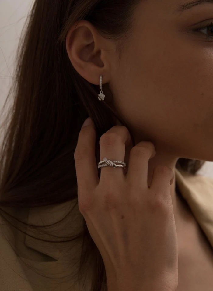 Hoop earrings with pendants and flower-shaped charm with zircons. A perfect piece to combine with other types of earrings. Sterling silver earrings with zirconia and composed of a small hoop that holds a flower motif