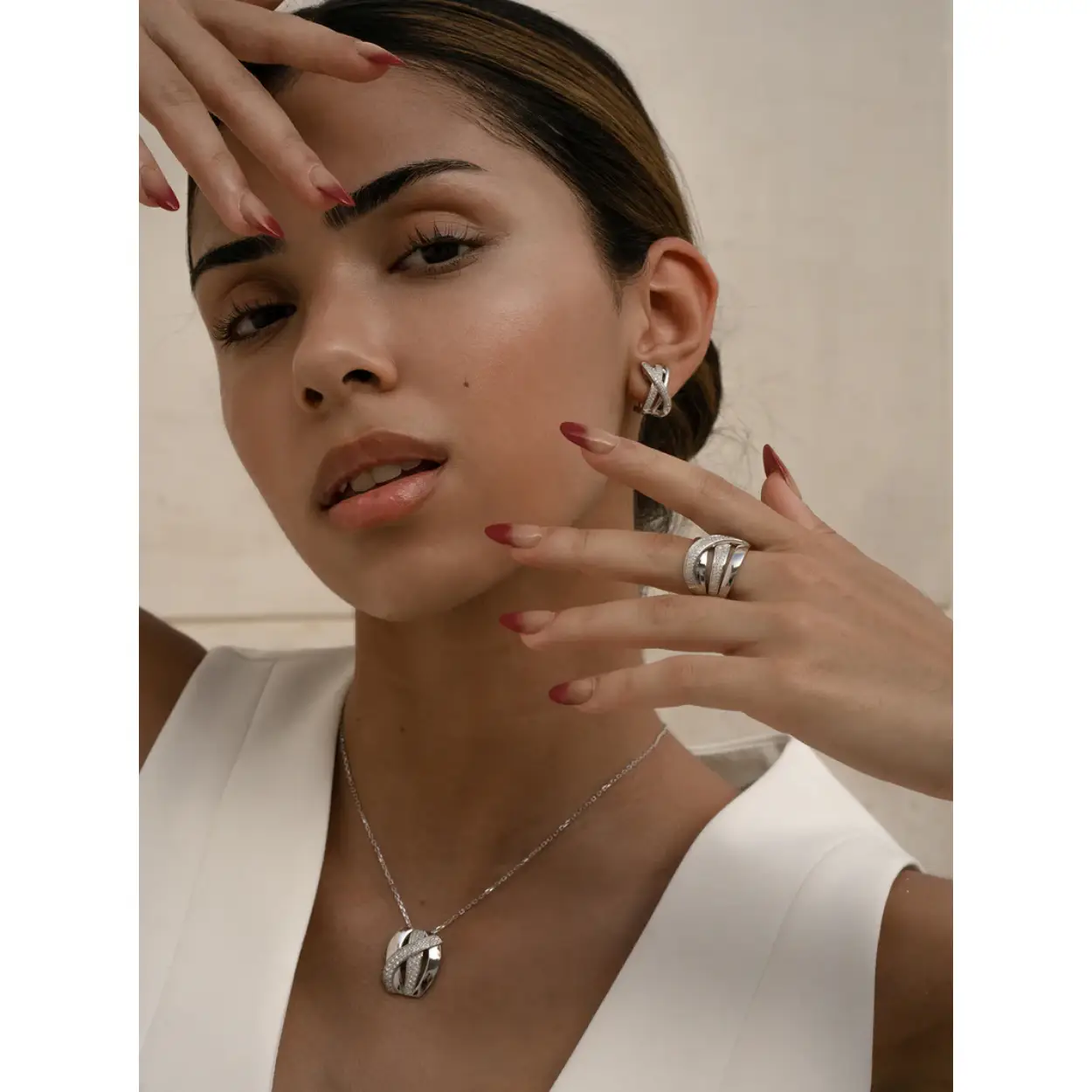 Large silver rings with crossed design and zircons. An elegant design perfect to combine with your outfits. Large silver ring with crossed rails design with zircons set. The perfect ring to wear with earrings and matching pendant that will make you shine like never before.