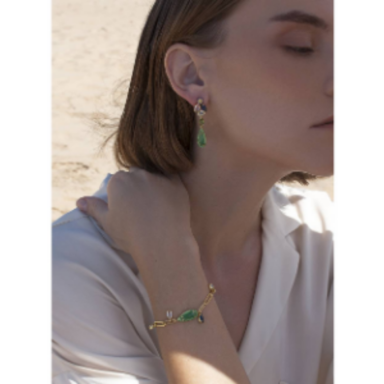 Armband met zilveren stenen voor dames. Een elegant en kleurrijk ontwerp, perfect om een ​​vleugje kleur aan je looks toe te voegen. Armbanden met stenen in verguld zilveren paperclip ketting met het hoofdmotief in een druppelvormige steen in een groene tint en secundaire motieven in de kleuren aventurijn en azuriet. Ideaal om te dragen met bijpassende oorbellen en collier.