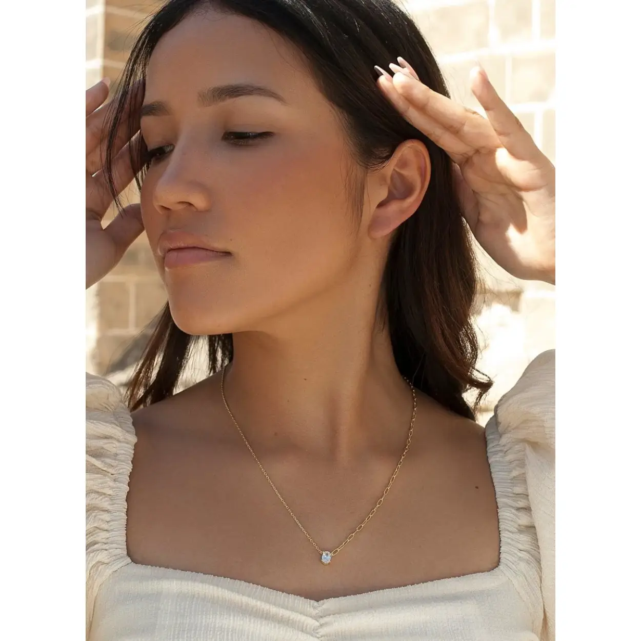 Kleine vergulde zilveren hanger met een ovaal motief van witte zirkonia en een dubbel kettingdetail: paperclip en normaal.