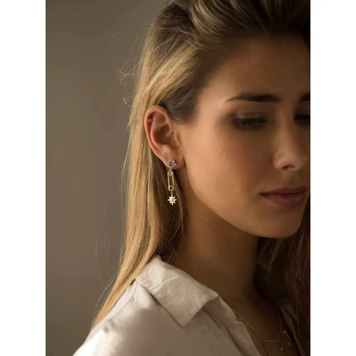 Vergulde zilveren oorbellen bestaande uit een veiligheidsspeld motief en zirkonia