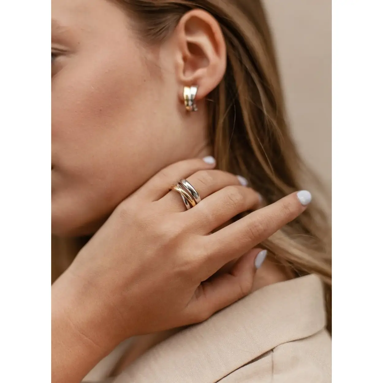 Zilveren ring met een twee kleurig ontwerp, twee rijen gewoon zilver en de andere in verguld zilver.