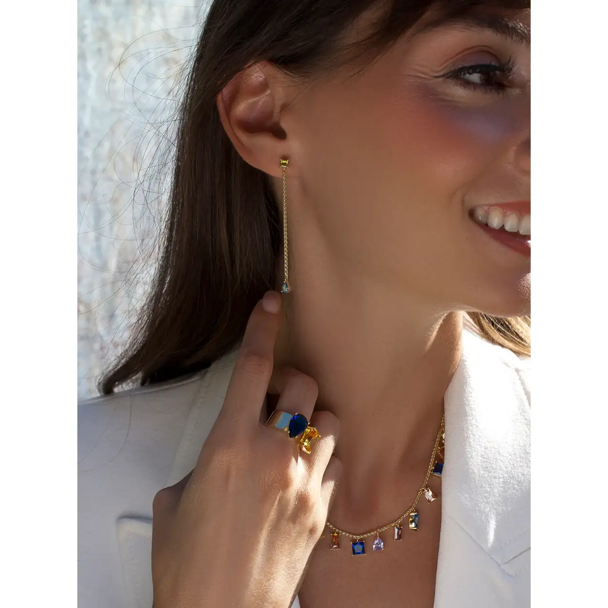 Long earrings with multicolored gemstones chain design. Colorful earrings perfect to complete your most special looks. Long gold plated silver earrings made up of two chains of unequal sizes with a gemstone at each end in chalcedony, apple green, orange and cherry tones. Ideal to combine with the matching necklace and ring, you will dazzle!