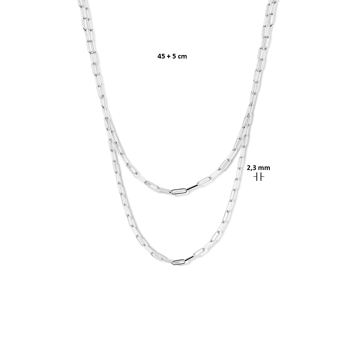 Gerhodineerd 925 zilveren collier uitgevoerd met een paperclip schakel van 2.3mm. Het collier heeft een draaglengte van 45cm met een extensie van 5cm en een karabijn sluiting.