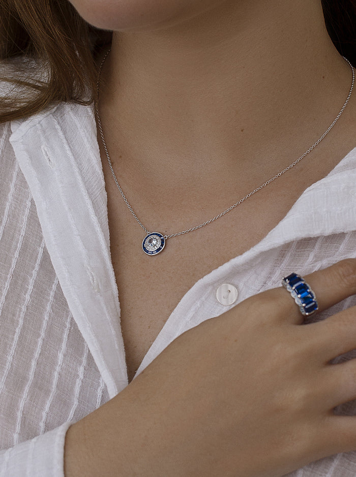 Necklaces with stones circular design blue tone. Design formed by a circle with princess cut azurite gemstones and a chalcedony gemstone surrounded by white zirconia. An ideal pendant to wear with earrings and matching ring and give a touch of color to your looks. You will dazzle.