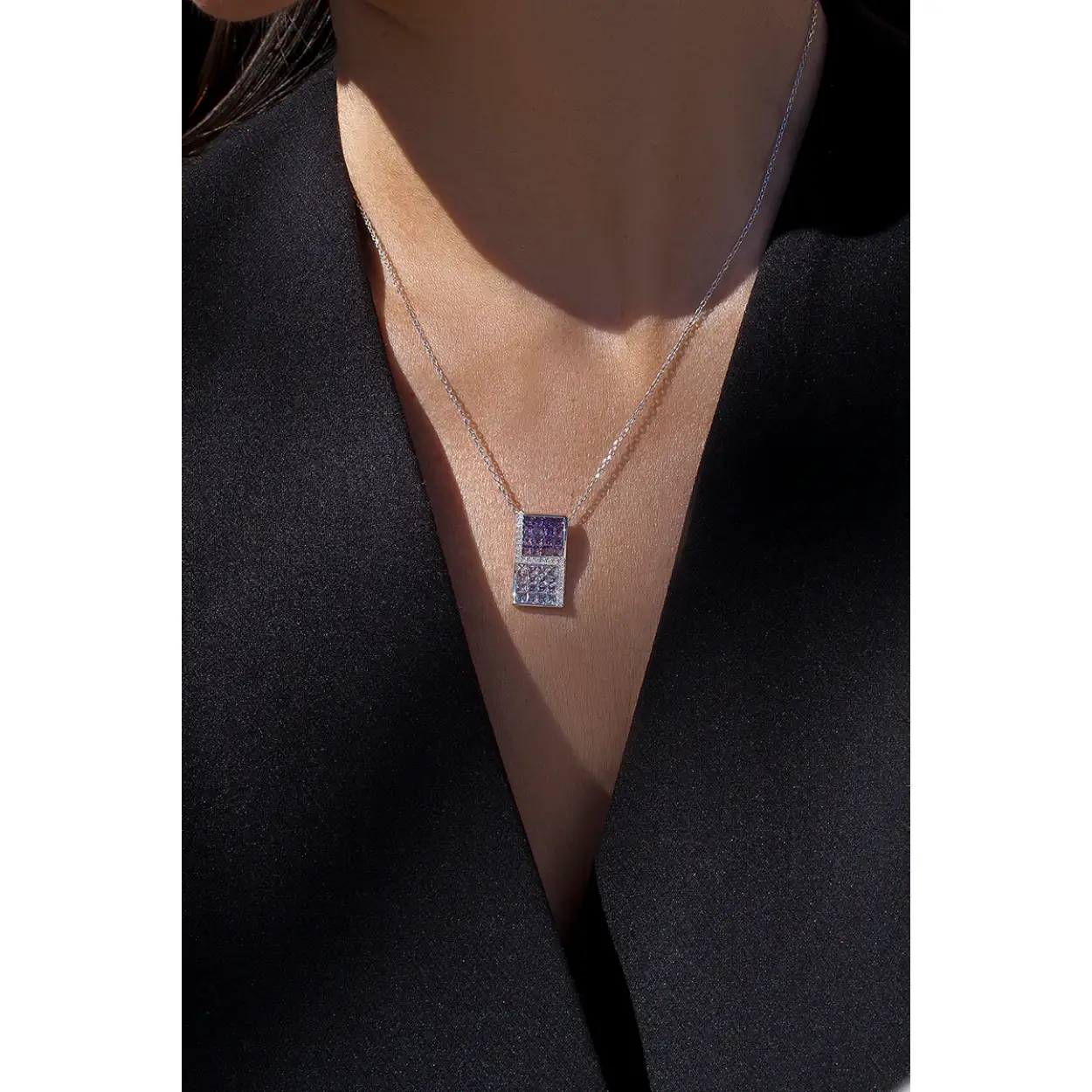 Necklaces with silver stones with violet gemstones and cubic zirconia for women. Silver pendant made up of three lanes of lavender and emerald-cut amethyst zirconia, surrounded by white zirconia. Combine it with the matching earrings and ring and get a total look, you will dazzle!
