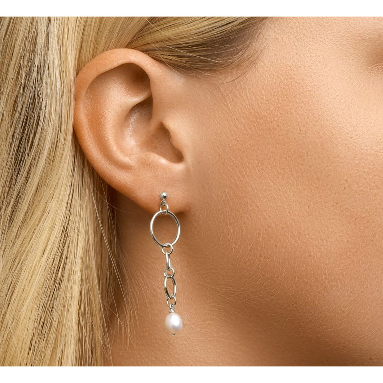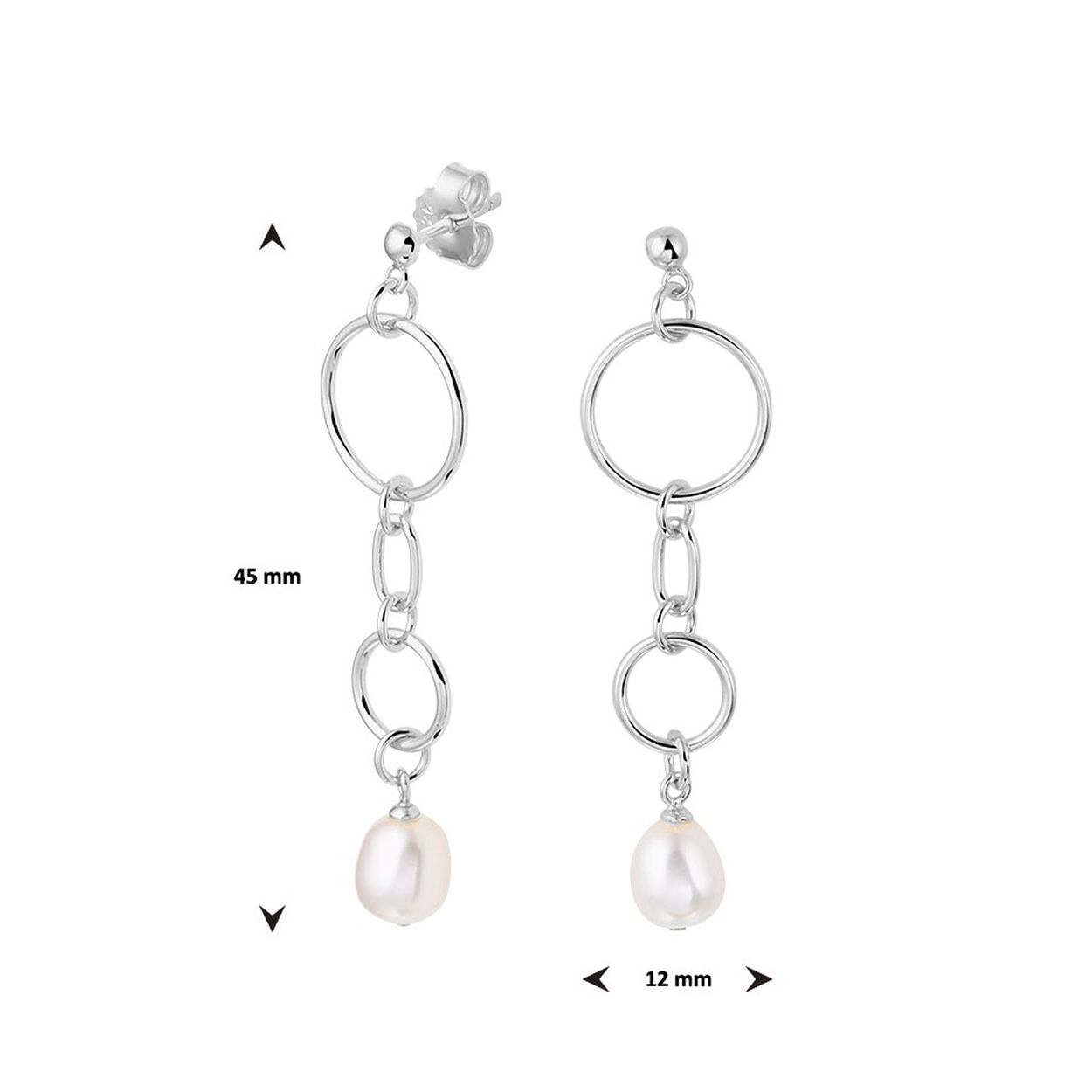Gerhodineerd 925 zilveren oorhangers uitgevoerd met een zoetwaterparel. De oorhangers hebben een totale hoogte van 4.5cm en een breedte van 12mm.