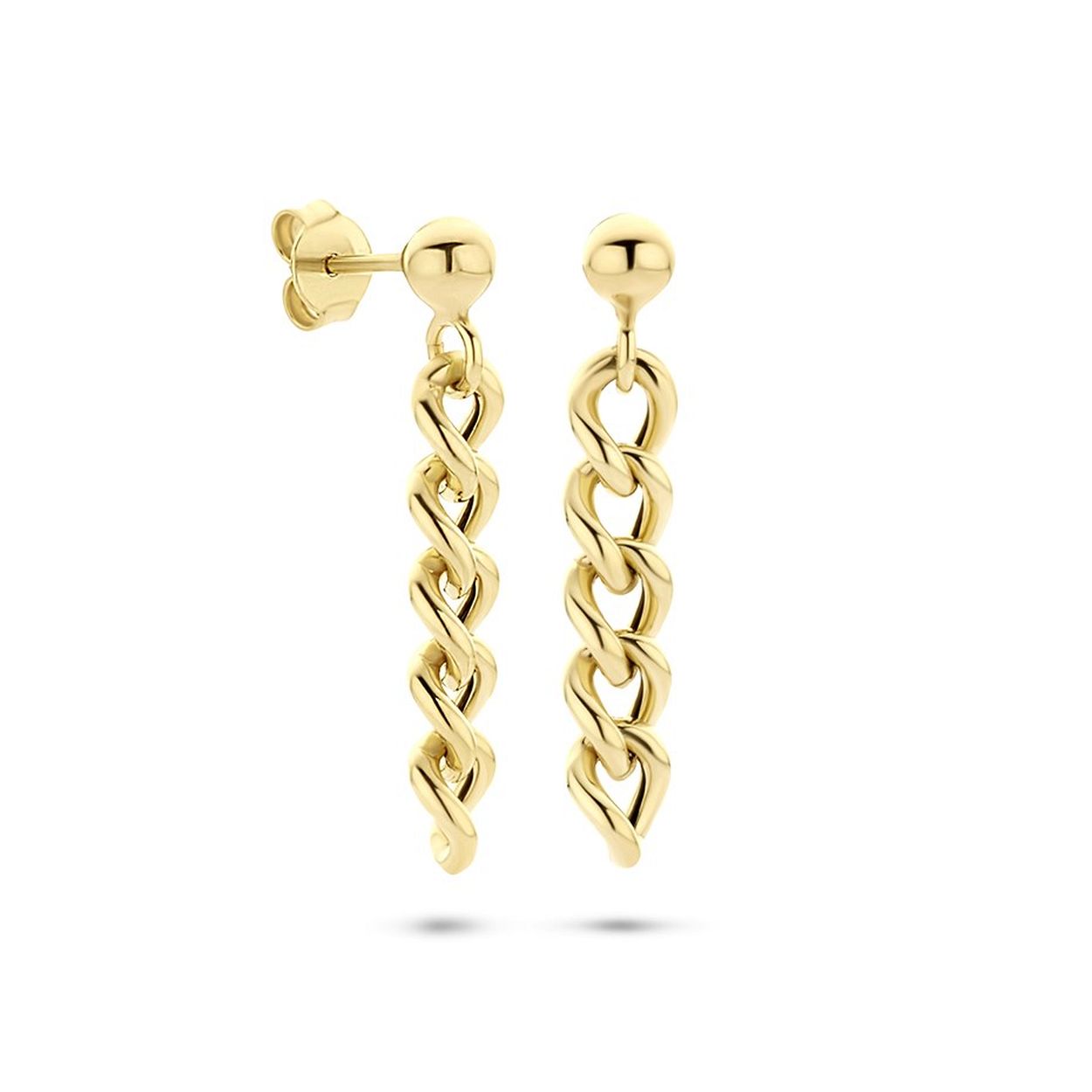 Geelgoud op 925 zilveren oorhangers uitgevoerd in schakelvorm. De oorhangers hebben een hoogte van 2.5cm en een breedte van 5mm.