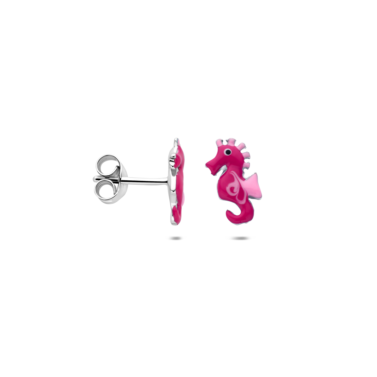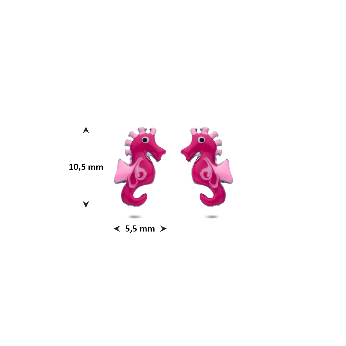 Gerhodineerd 925 zilveren oorknoppen uitgevoerd in de vorm van een zeepaardje. De oorknoppen hebben een afmeting van 10,5x5,5mm.
