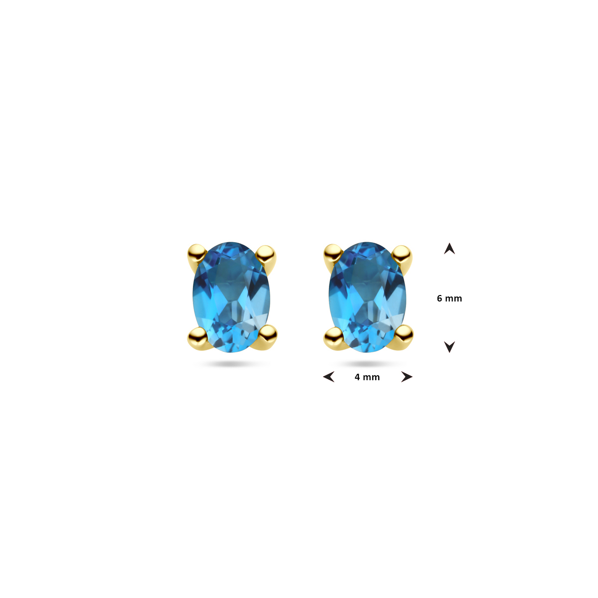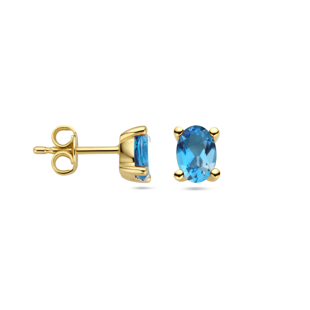 14k Geelgouden oorknoppen uitgevoerd met london blue topaas. De steen heeft een afmeting van 6x4mm.