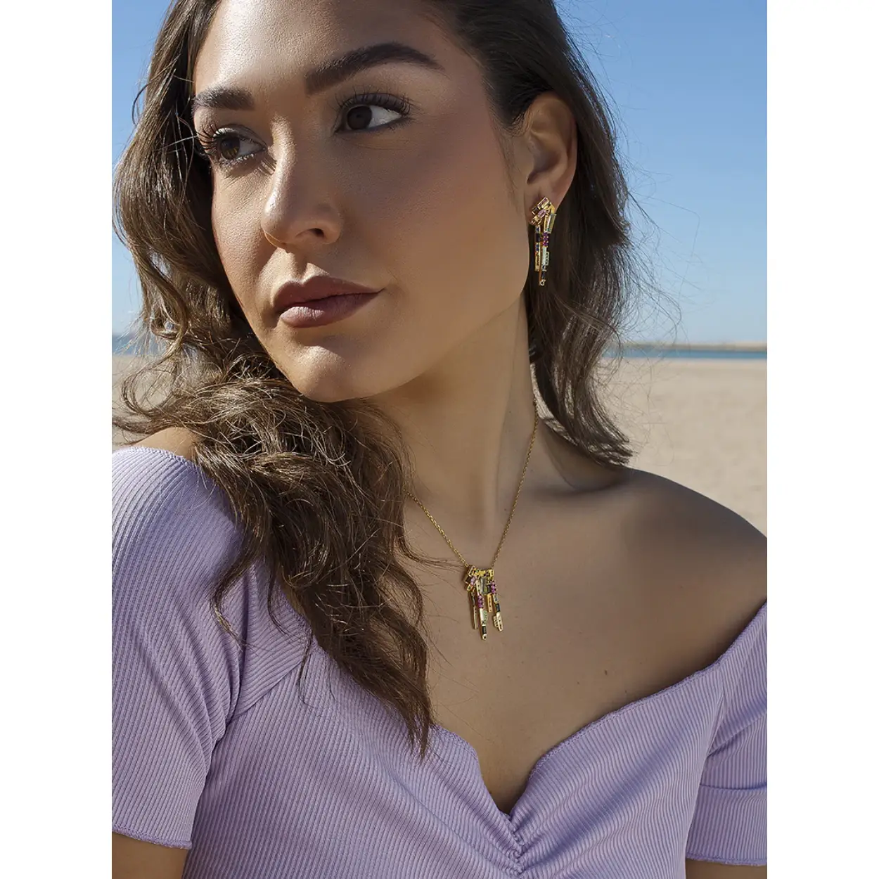 Original silver earrings multicolor chaos design for women. Original design perfect to give a touch of originality to your looks. Original gold plated silver earrings with chaos design of adamantine quartz in fuchsia, blue, pink, aventurine, sapphire, peach and black tones. Ideal to combine with the matching pendant. A fun design with which you will dazzle.