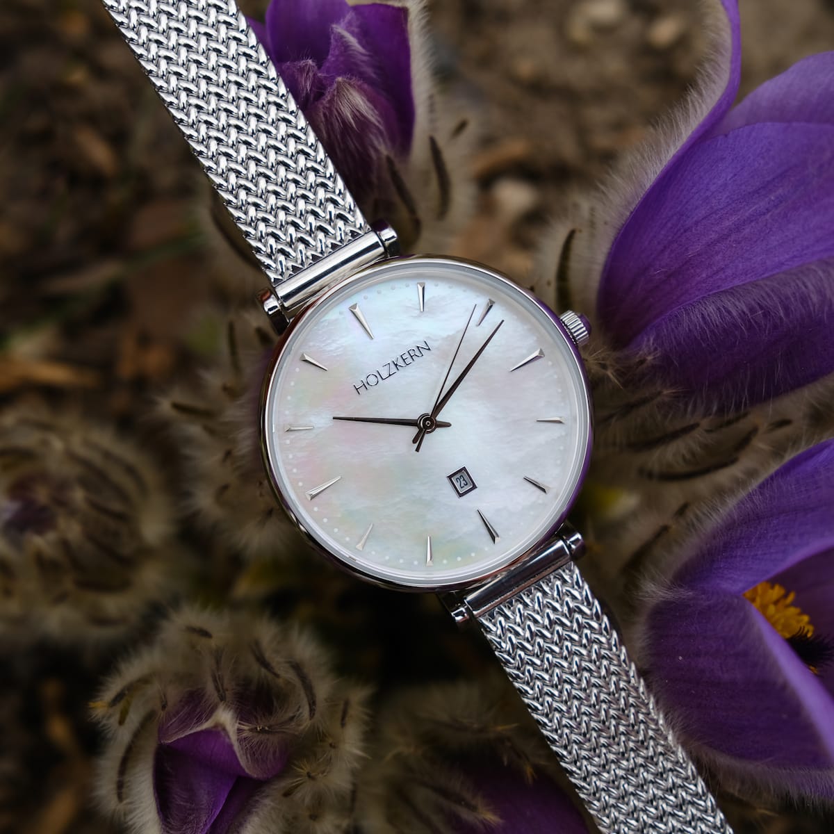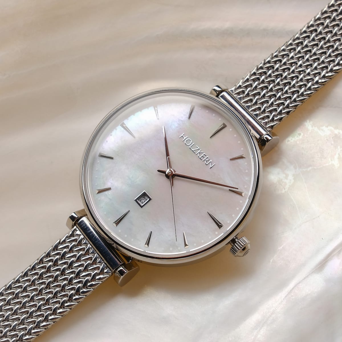 Holzkern stalen horloge met parelmoerwijzerplaat en milanaise band.