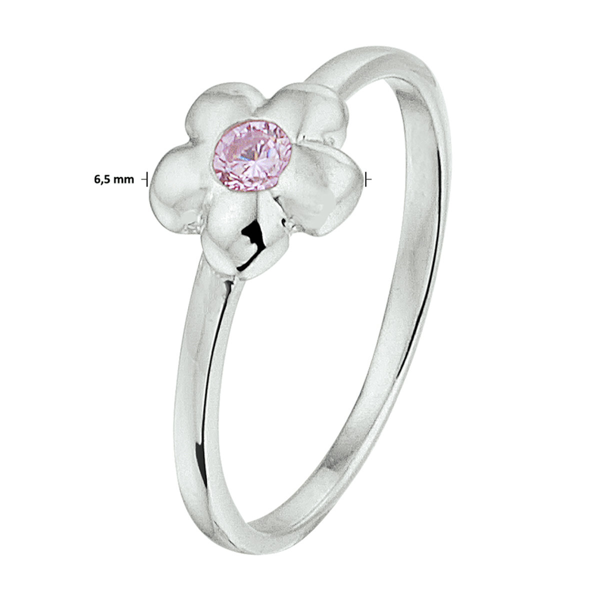 Schattige gerhodineerd zilveren bloem ring met een breedte van 6.5mm. De ring heeft een poli afwerking en is uitgevoerd met roze zirkonia. Tip: Leuk om kado te geven! Info: Gerhodineerd zilver is door de rhodiumlaag beter bestand tegen verkleuren en krassen.