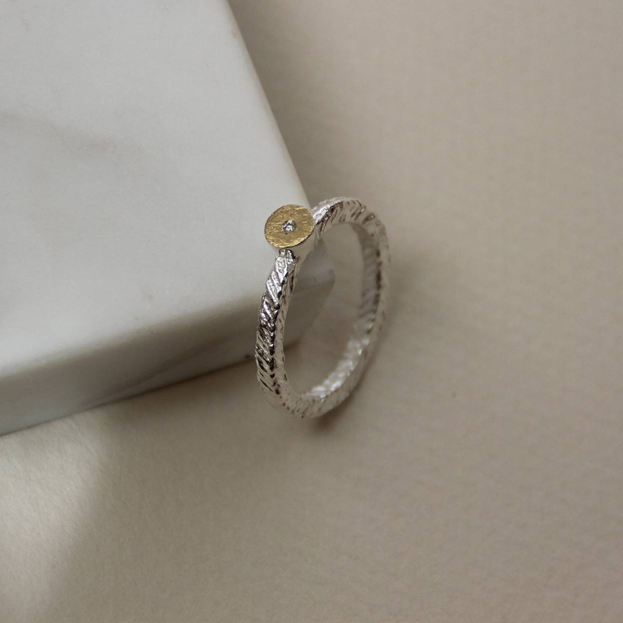 925 white silver ring with 18k yellow gold and one diamond. Small size.