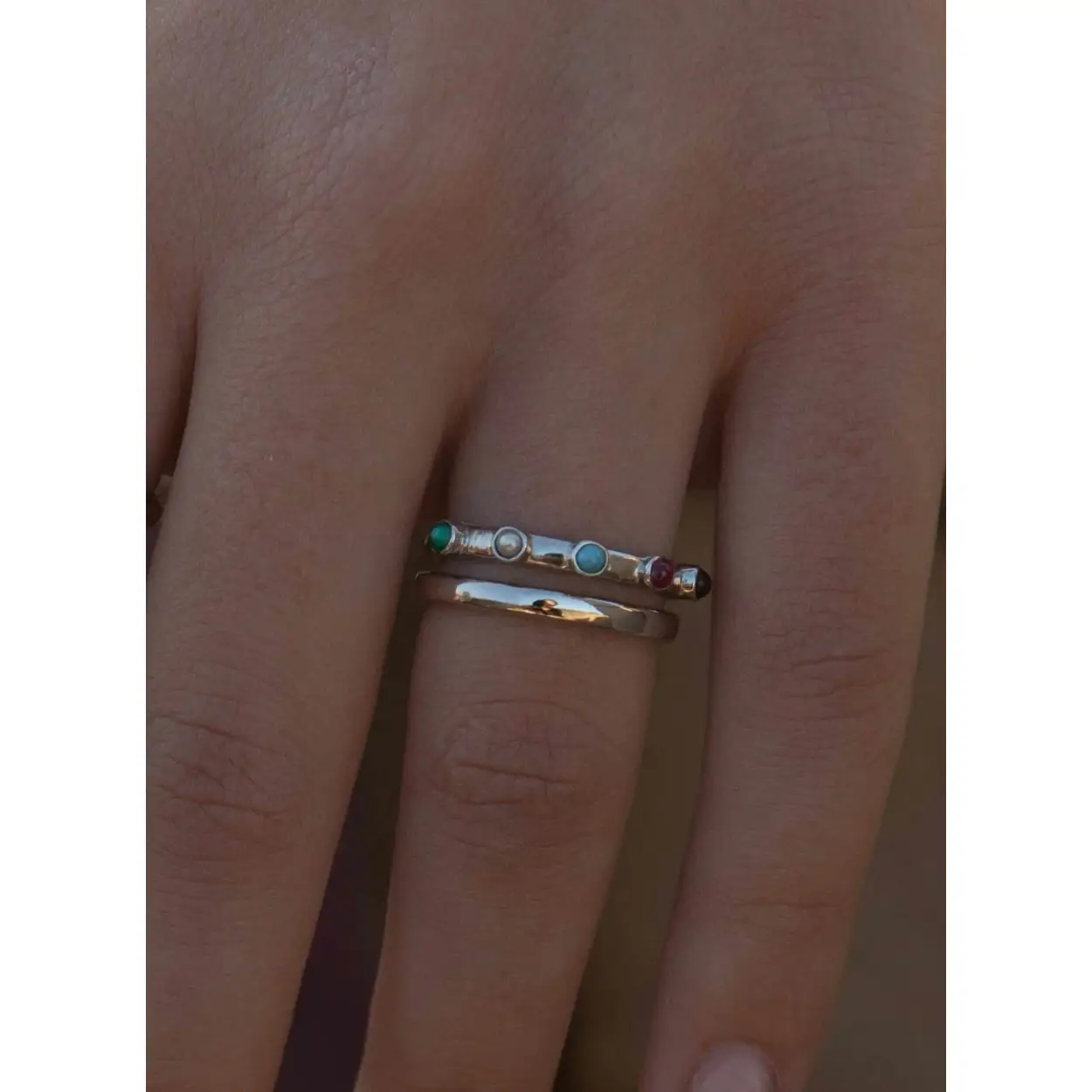 Gold plated silver rings double design with five motifs of gems in black, fuchsia, blue, white and sky blue with a pearl.