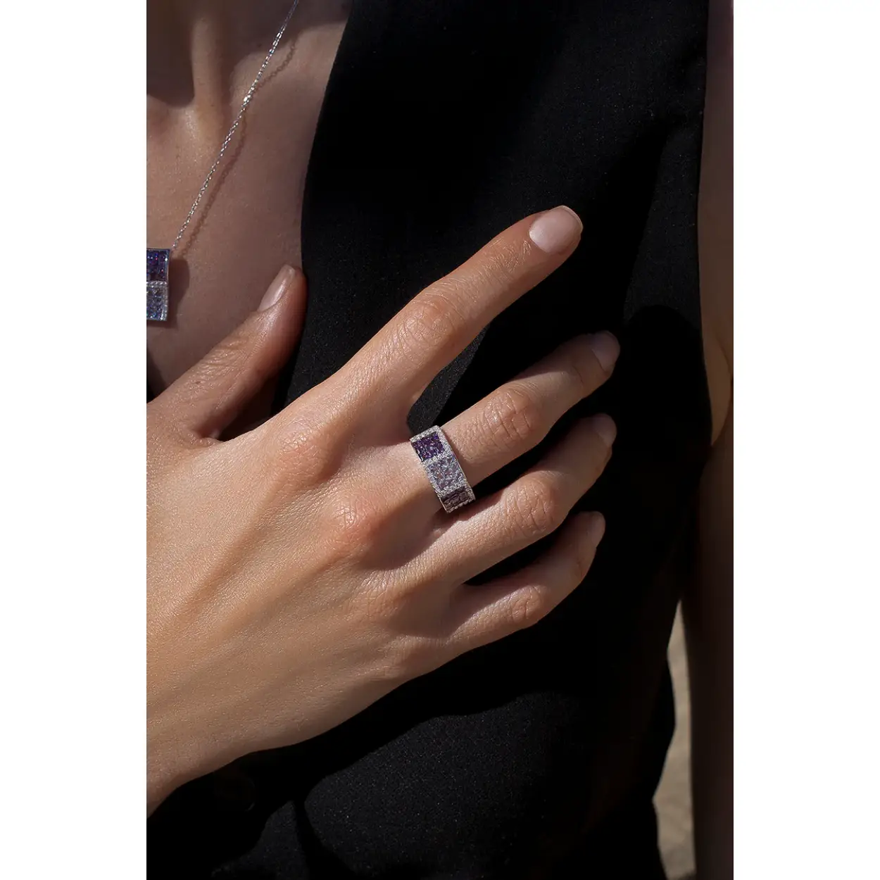 Rings with silver stones with violet gemstones and cubic zirconia for women. Silver ring formed by three lanes of lavender zirconia and emerald cut amethyst, surrounded by white zirconia. Combine it with the matching earrings and pendant and get a total look, you will dazzle!