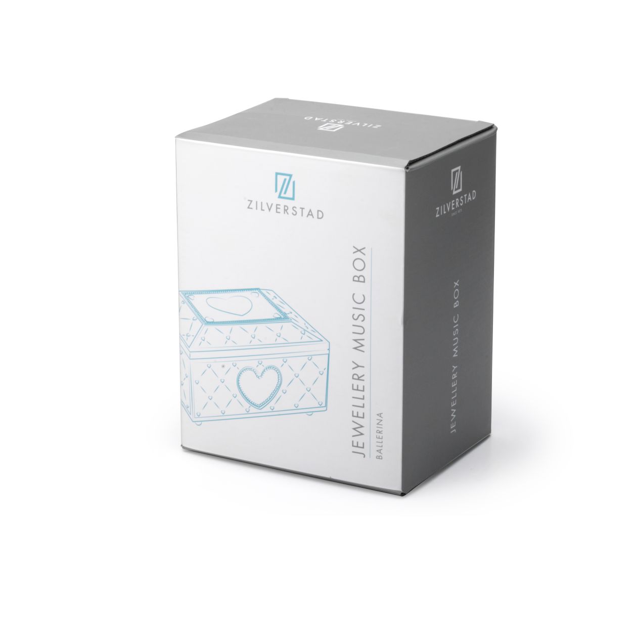 Sieradendoos met muziek (melodie "Für Elise") en ronddraaiende ballerina. Binnenzijde roze velours met spiegel en diverse vakken voor het opbergen van sieraden. De buitenzijde is verzilverd en gelakt waardoor poetsen overbodig is.