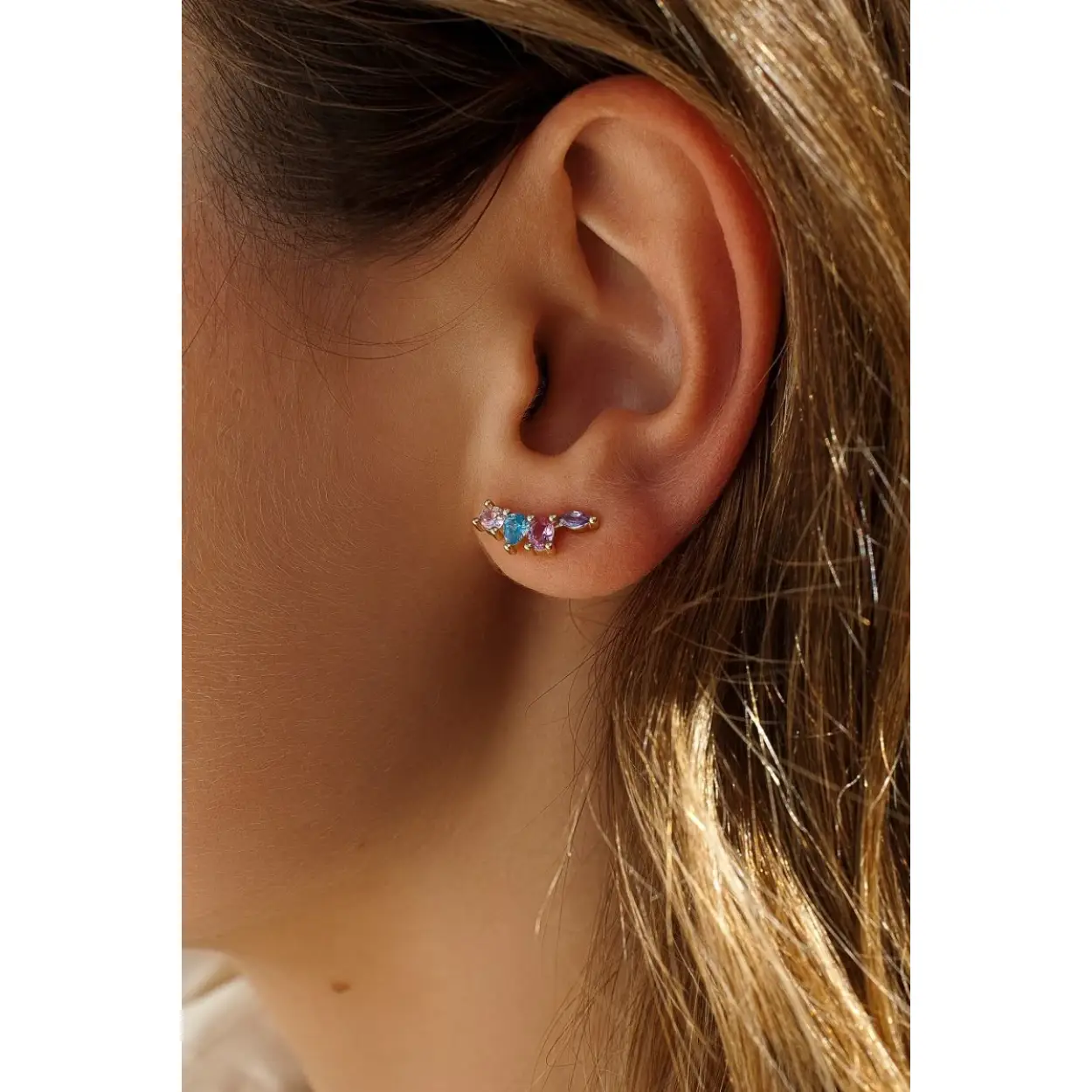Gold plated sterling silver earrings made up of a round rose quartz, a pear-shaped blue one, a purple oval-shaped one and a lilac marquise-shaped one.
