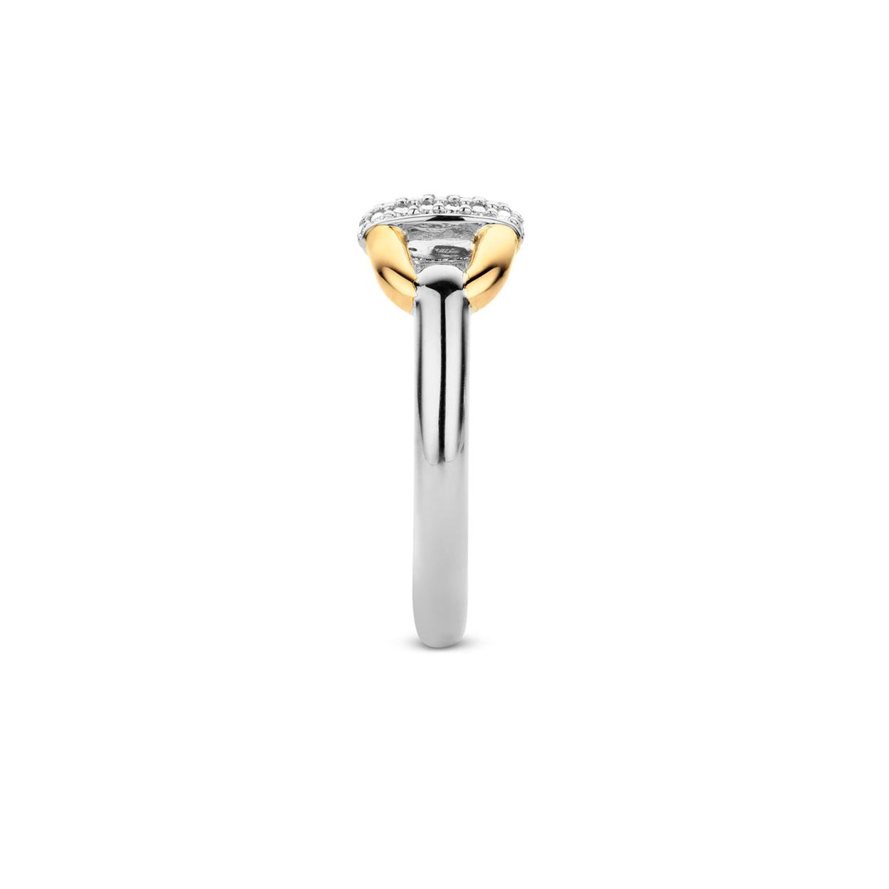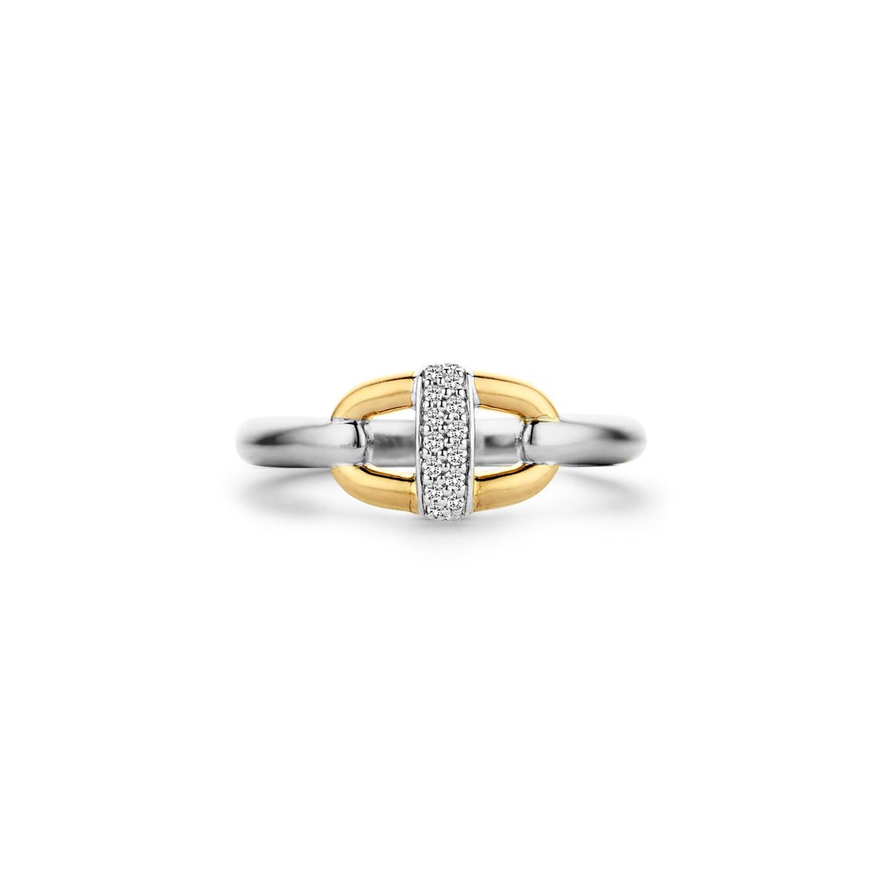 De ene kant verbonden met de ander. Het gevlochten textuur van het goud ovalen kernelement komt samen middels een band met witte zirkonia pavé zetting. Krachtig maar delicaat.