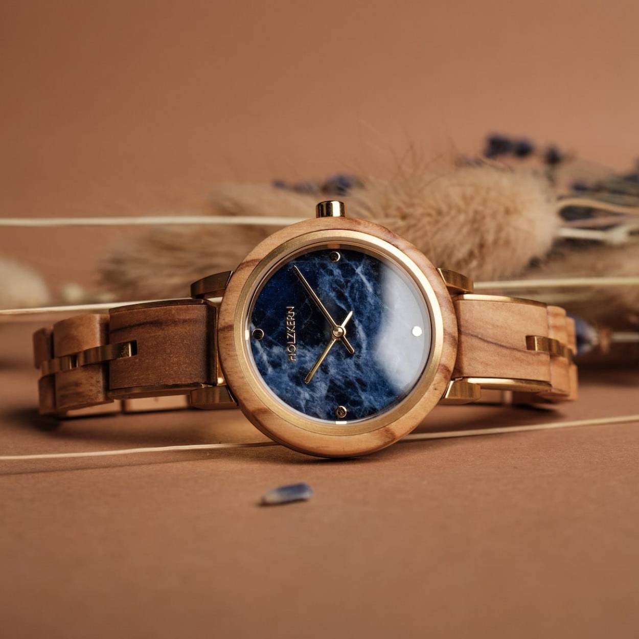 The smooth interplay between olive wood, blue sodalite and stainless steel elements in gold is inspired by the starry heavens and is meant to encourage you to think creatively every day.