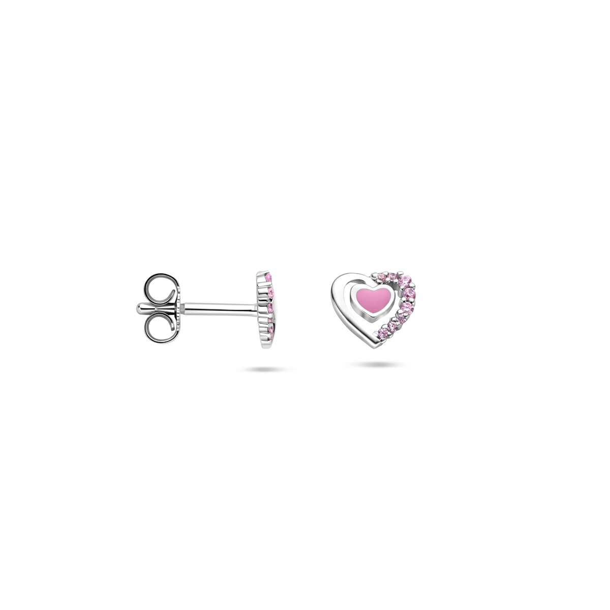 Gerhodineerd 925 zilveren oorknoppen uitgevoerd met hartjes en roze zirkonia. De oorknoppen hebben een afmeting van 6x6.5mm.