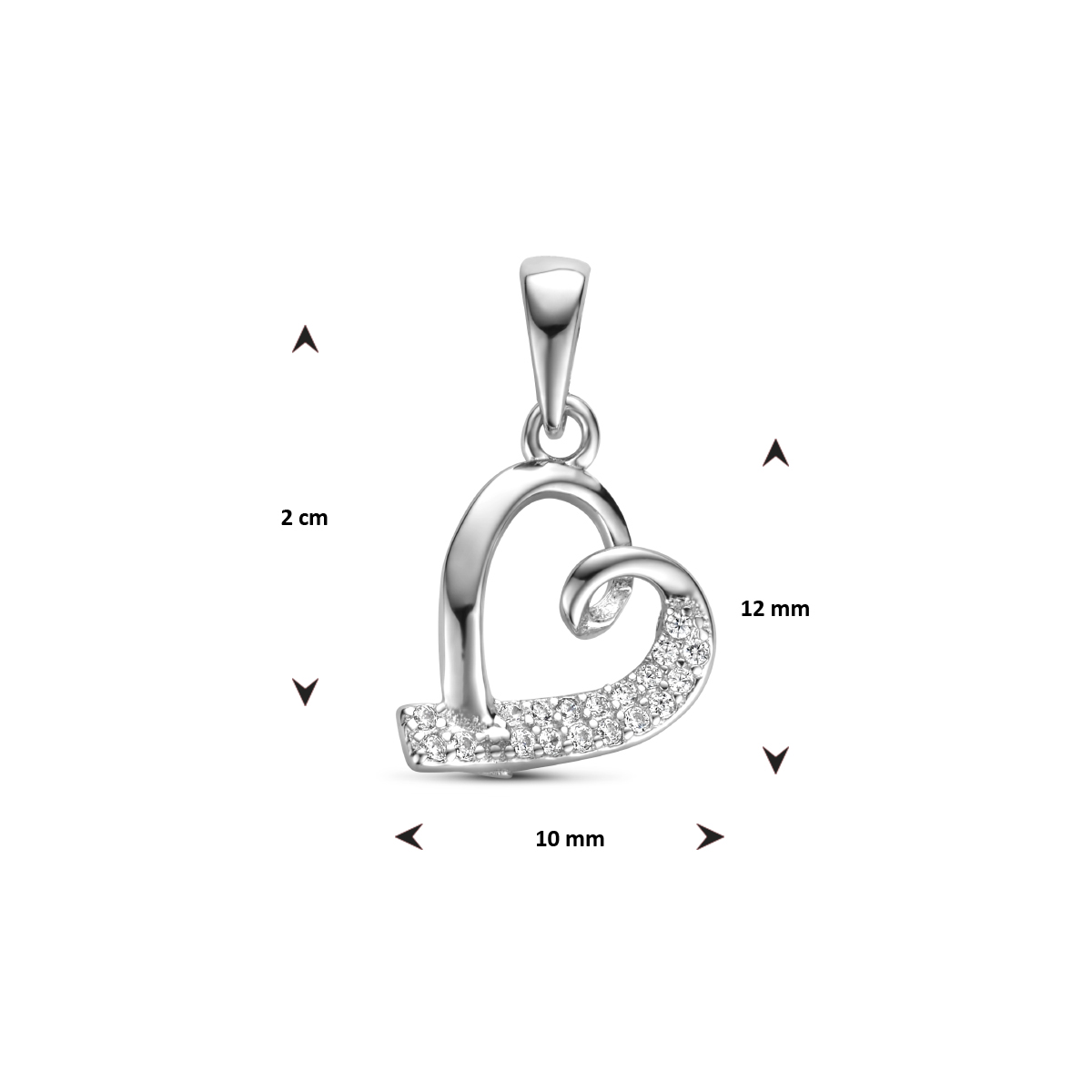 Gerhodineerd 925 zilveren hanger uitgevoerd in de vorm van een hartje met zirkonia. De hanger heeft een totale hoogte van 2.0cm en een breedte van 10mm.
