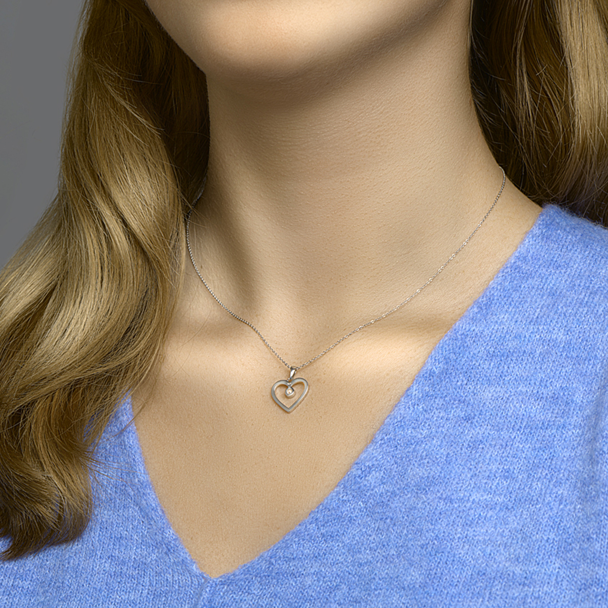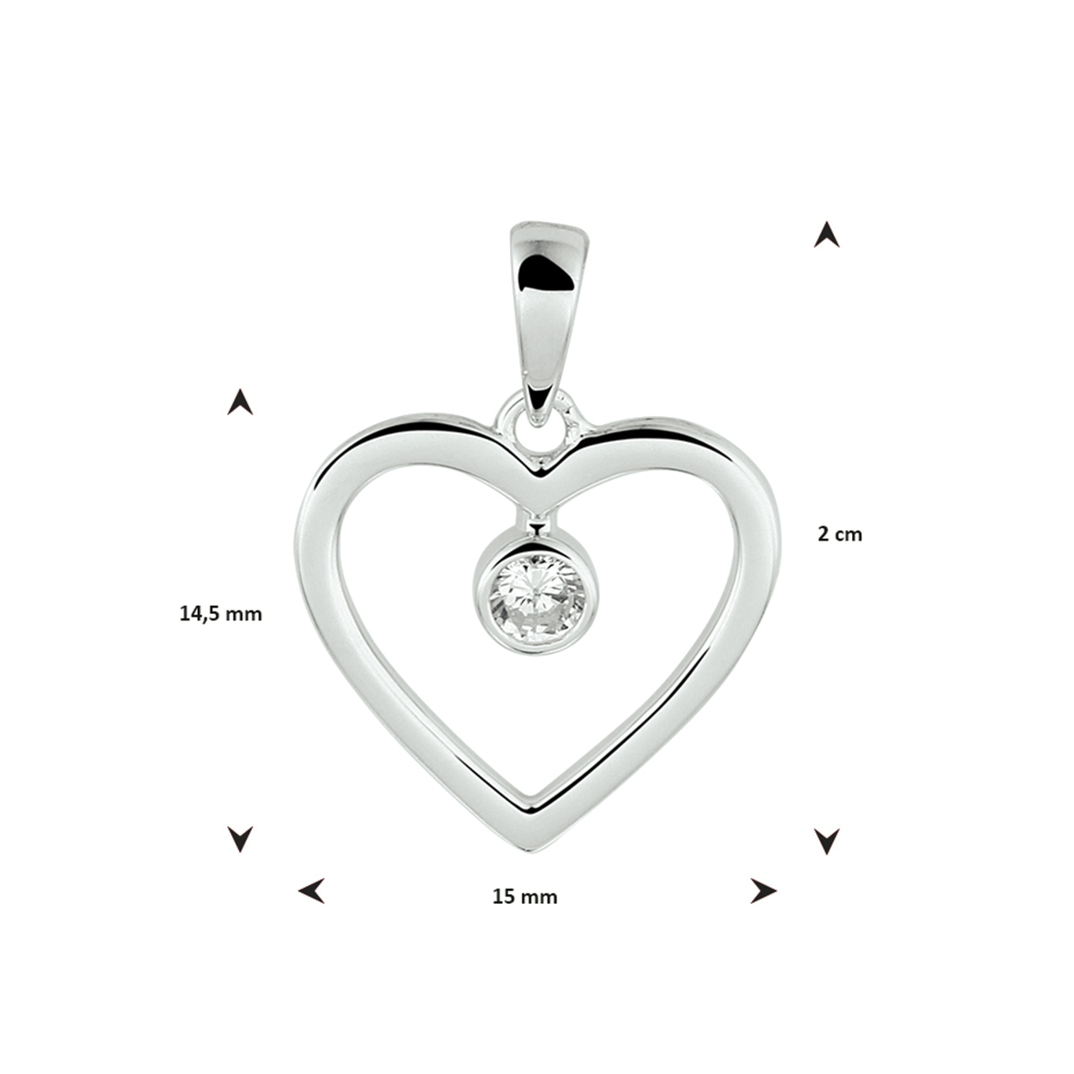 Gerhodineerd 925 zilveren hanger in de vorm van een hart en uitgevoerd met een heldere zirkonia. De hanger heeft een totale hoogte van 2cm en een breedte van 15mm.