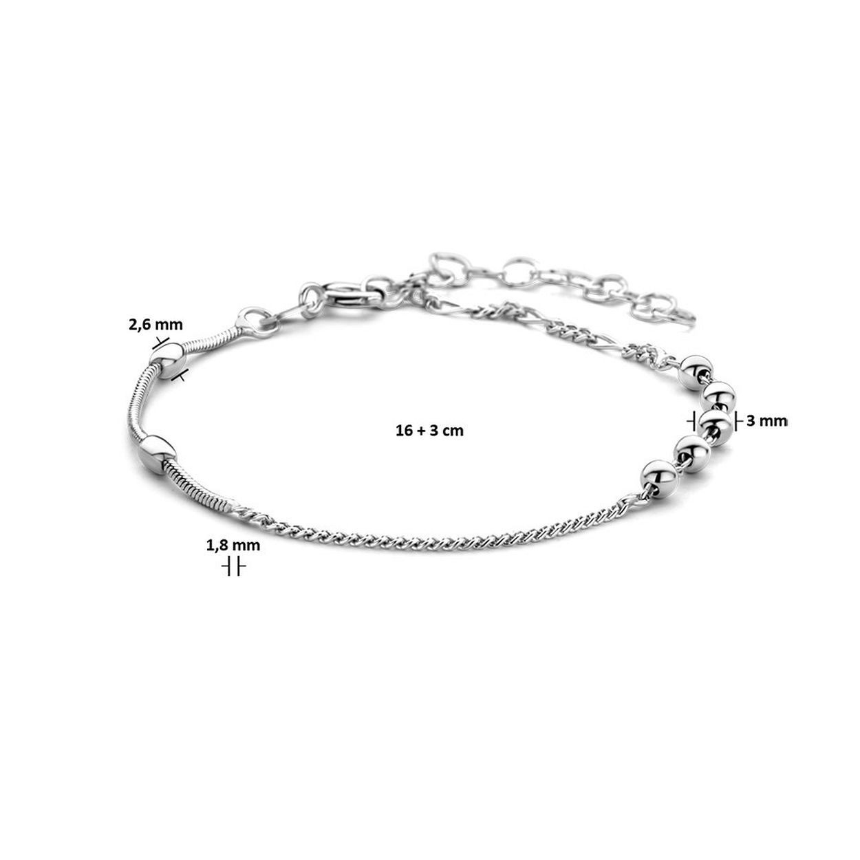Gerhodineerd 925 zilveren armband uitgevoerd met vier verschillende schakels. De armband heeft een breedte van 3mm en een draaglengte van 16cm met een extensie van 3cm.