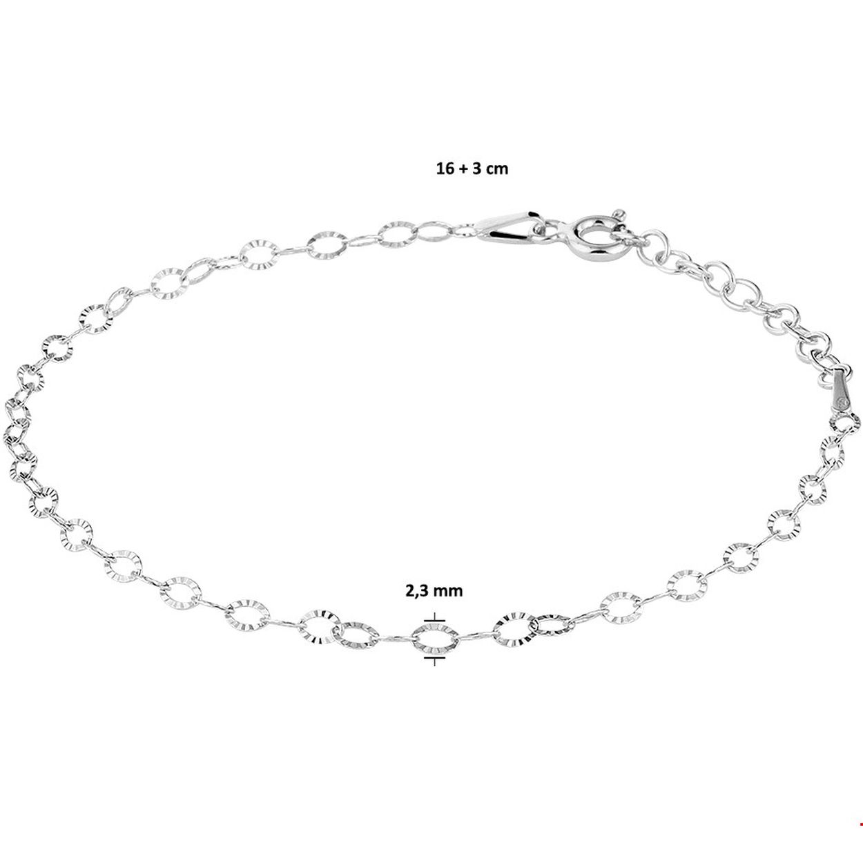 Gerhodineerd zilveren armband met een schakelbreedte van 2.3mm. De armband heeft een draaglengte van 16cm en een extensie van 3cm. Info: Gerhodineerd zilver is door de rhodiumlaag beter bestand tegen verkleuren en krassen.