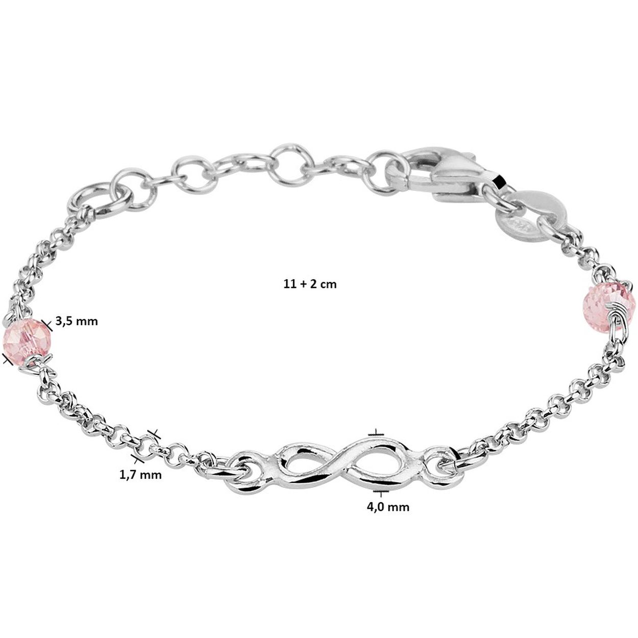Zilveren armband met een infinity teken en roze strass steentjes.
