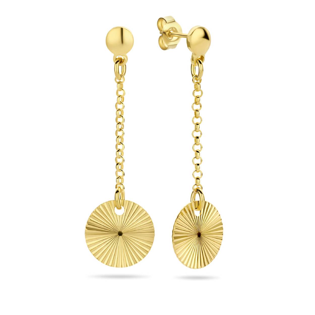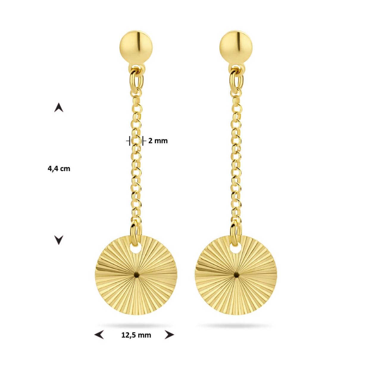 Geelgoud op 925 zilveren oorhangers uitgevoerd met een rondje. De oorhangers hebben een totale hoogte van 4.4cm. Geen garantie op de plating.